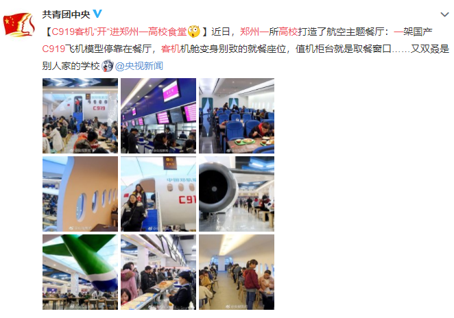 前段時間,微博@共青團中央分享的一則“C919客機‘開’進鄭州一高校食堂”的消息引起網友熱議,評論精彩紛呈。