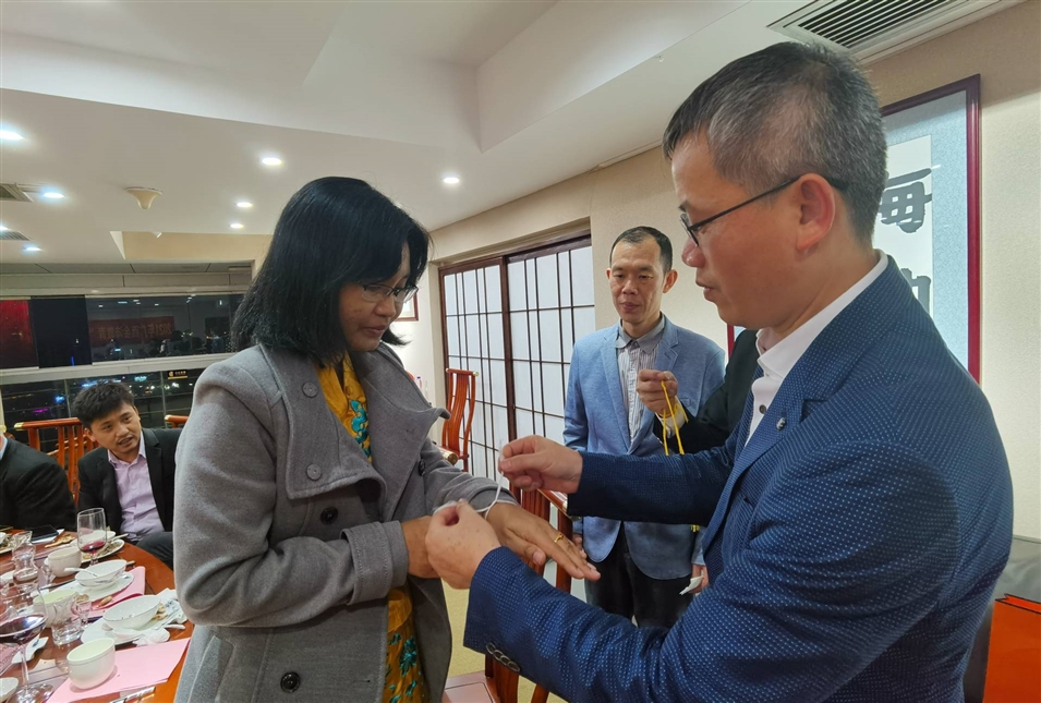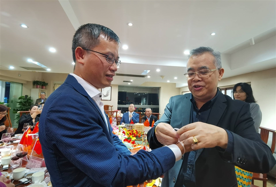 (老撾駐南寧總領(lǐng)事館總領(lǐng)事維拉薩宋蓬先生為致公黨廣西區(qū)委秘書(shū)長(zhǎng)兼辦公室主任李永政先生栓線(xiàn)禮節(jié))