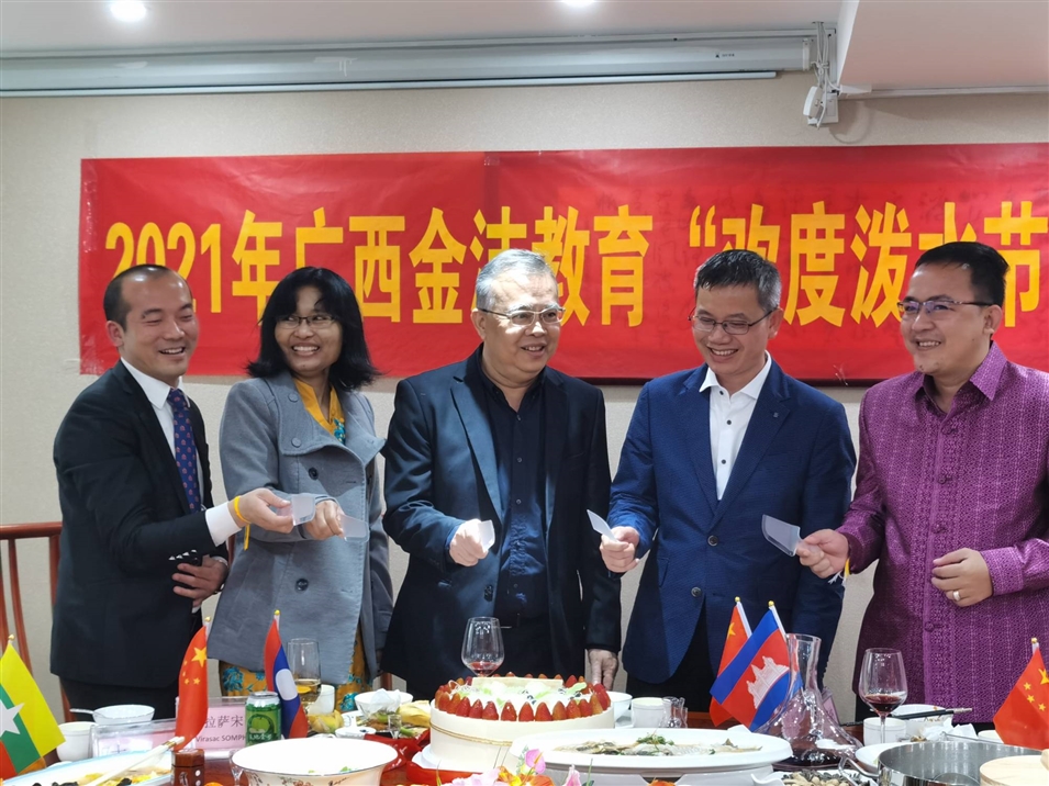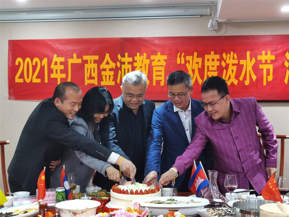(老撾駐南寧總領(lǐng)事館總領(lǐng)事維拉薩宋蓬先生、柬埔寨駐南寧總領(lǐng)事館領(lǐng)事龍瓦塔納先生、緬甸駐南寧總領(lǐng)事館領(lǐng)事佳吉文女士、致公黨廣西區(qū)委秘書(shū)長(zhǎng)兼辦公室主任李永政先生、廣西金沛教育執(zhí)行董事粟宥朝先生共切潑水節(jié)及中國(guó)共產(chǎn)黨成立100周年蛋糕)