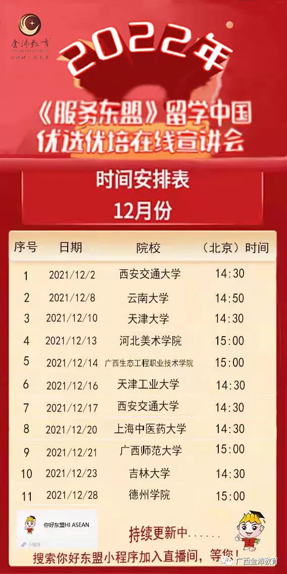2021122日起,由我司聯(lián)合多所高校開(kāi)展的“2022年留學(xué)中國(guó)優(yōu)選優(yōu)培線上直播宣講會(huì)將積極利用直播新形勢(shì)在你好東盟微信小程序上進(jìn)行開(kāi)播。學(xué)校和師生、家長(zhǎng)可通過(guò)小程序你好東盟、FacebookYoutube直播等多種途徑收看本次宣講會(huì)。