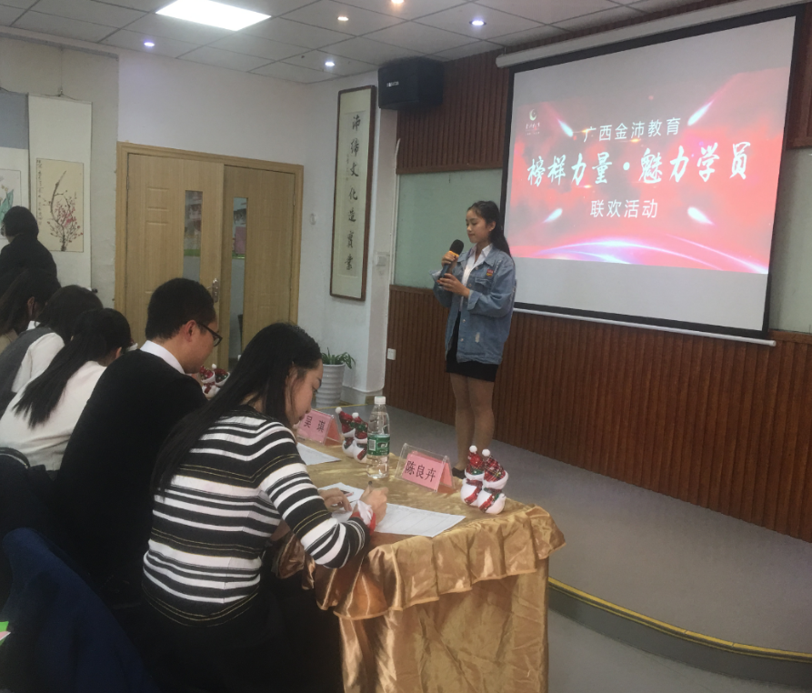 本次活動(dòng)由廣西金沛教育發(fā)展有限公司南湖校區(qū)主辦,旨在通過本次的匯報(bào)演講,促進(jìn)學(xué)員交流。金沛教育領(lǐng)導(dǎo)及金沛高級(jí)教師到現(xiàn)場(chǎng)觀摩了學(xué)員的演講,并為獲獎(jiǎng)選手頒獎(jiǎng)。