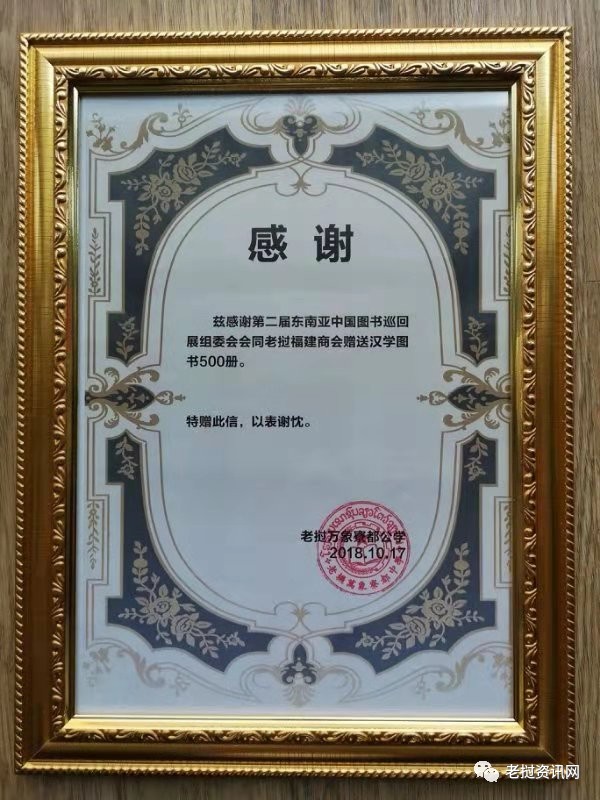 贈(zèng)書活動(dòng)儀式安排在學(xué)校會(huì)議室舉行,寮都公學(xué)董事長林俊雄從老撾福建商會(huì)代表們手中接過由第二屆東南亞中國圖書巡回展組及老撾福建商會(huì)共同向竂都公學(xué)捐贈(zèng)的價(jià)值近3萬元的圖書。據(jù)介紹,本次捐贈(zèng)圖書內(nèi)容涵蓋中國傳統(tǒng)文化、經(jīng)典文學(xué)、漢語學(xué)習(xí)為主等各類圖書500冊。交接儀式結(jié)束完畢后,林俊雄董事長當(dāng)場向老撾福建商會(huì)代表頒發(fā)了受贈(zèng)感謝狀。