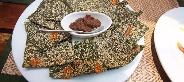 老撾是東南亞唯一的內陸國,海產(chǎn)品相對周邊鄰國少了很多,可是流經(jīng)老撾的湄公河盛產(chǎn)河苔,是一道著名的下酒菜。這道菜的老撾名叫Khai Paen,將河苔片下油鍋炸至酥脆后撒上芝麻,搭配檸檬草、花生、蘸醬等一起吃,味道極其鮮美。
