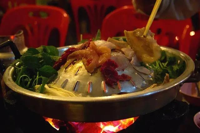 老式火鍋為涮烤兩吃,跟中式火鍋還是有很大區(qū)別的?;疱伒男螤罡褚粋€有沿兒的平底鍋,中間高高鼓起,可用于燒烤,周圍盛湯用于涮煮,還有大廚現(xiàn)場烤制的大蝦、生蠔、牛肉串等食物,配上一瓶老撾啤酒,盡享美食。