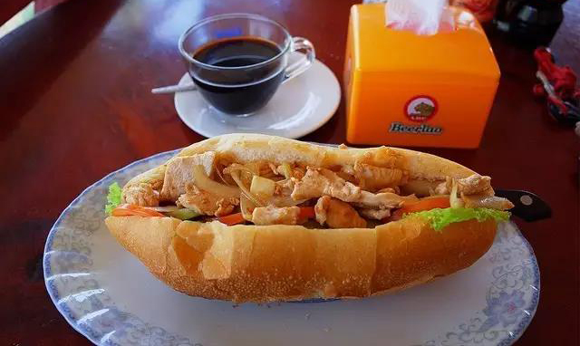 老撾語叫khao ji,之所以在老撾如此常見是跟法國的殖民歷史密切相關,無論是餐廳還是路邊攤,法棍隨處可見,游客們最愛的還是將法棍面包切成兩半后夾入一些雞肉、牛肉、火腿、豬肉、雞蛋、蔬菜等不同餡料和醬料,制成三明治,既美味又實惠。