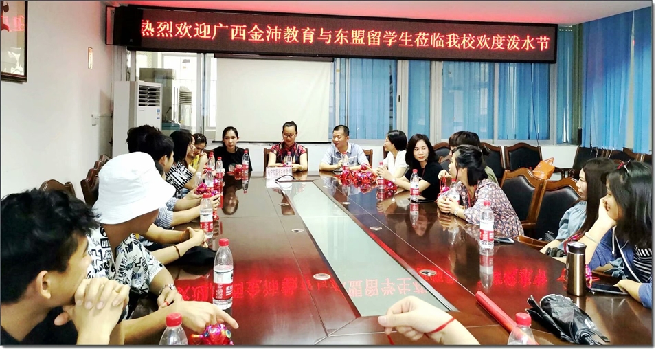 南寧市第十五中學(xué)盧副校長及譚主任親自到校門迎接并在會議室熱情接待了大家。在歡迎會上,盧副校長向東盟各國留學(xué)生介紹了學(xué)校概況并送上壯族特色的繡球表示歡迎。南寧市第十五中學(xué)是東盟文化相融合的特色高中,至此高考來臨之際,為增進(jìn)師生互動,緩解高三學(xué)子的考試壓力,學(xué)校以東盟特色的潑水方式傳遞祝福、共同祈愿,同時也為中國學(xué)生與留學(xué)生提供了一個文化交流平臺。