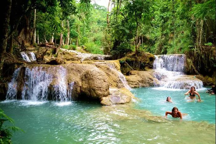 這里是一座寬廣的多層瀑布,瀑布總高100米,瀑布從石灰石山峰傾瀉而下,注入下面一系列清涼、翠綠色的水潭中。三層瀑布傾瀉而下,形成多個(gè)泛著藍(lán)綠色光澤的水潭,這里的景色像極了九寨溝的五彩池。陽光透過樹葉的間隙灑在涓涓溪流中,溪面就好像是一片片破碎的鏡子,點(diǎn)點(diǎn)地閃爍魚鱗般的光,如夢似幻,讓人迷醉。在這里最熱門的活動莫過于大樹繩索跳水,在水潭內(nèi)嬉戲不要著急上岸,可以安靜的在水里享受一下純天然免費(fèi)小魚SPA。