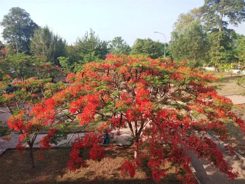 宿舍區(qū)有一片小森林,午后或者晚間,可以跟朋友一起散步,特別是炎熱的夏季,感受習習涼風,整個人神清氣爽,四月的宿舍樓下環(huán)境很迷人的,樹木長滿了紅花,就像火熱的天氣,好像在宣告著:夏天來了