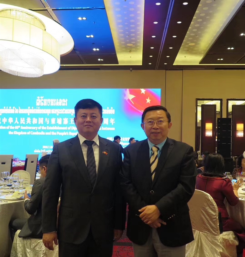 2018年北京,應(yīng)柬埔寨駐華大使邀請(qǐng),中國—東盟商務(wù)理事會(huì)執(zhí)行理事長(zhǎng)許寧寧出席慶祝中柬建交60周年招待會(huì)。招待會(huì)上,與柬埔寨駐華大使館公使銜商務(wù)參贊鐵弓交談。