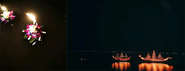 水燈是用象征著力量和財(cái)富的芭蕉葉折疊制成的,有的折成葵花狀,有的折成寶塔狀,折好的水燈上會插上鮮花和香燭,燃放爆竹之后,人們將香燭點(diǎn)燃,緩緩放入水中。剎那間,映著傾城月色,河面上燈火萬點(diǎn),忽遠(yuǎn)忽近,隨波漂蕩,蔚為壯觀。